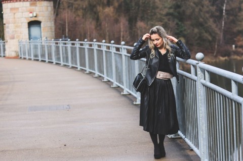 Den nächsten Look zeige ich Euch mit einem Plisseerock, den ich bereits in dem oben erwähnten Blogartikel präsentiert habe. Damals habe ich ein tolles schickes Styling kreiert. Nun diesmal zeige ich Euch, wie so ein Rock genauso schön als sportliche Variante kombiniert wird. Auch hier wähle ich ein T-Shirt mit einem Aufdruck. Coca-Cola Print in Pink passt farblich sehr gut zu dem Rock in Metallic-Rosa. Schwarzes Shirt bildet einen tollen Kontrast zu dem hellen Rock und zusammen mit dem neonfarbigen Schriften sowie gelber Tasche einen tollen und bunten Look, der mich an 80er Jahre erinnert. Bei kälterem Wetter ergänze ich das Outfit mit einer Lederjacke. So bekommt ein Styling einen rockigen Charakte.