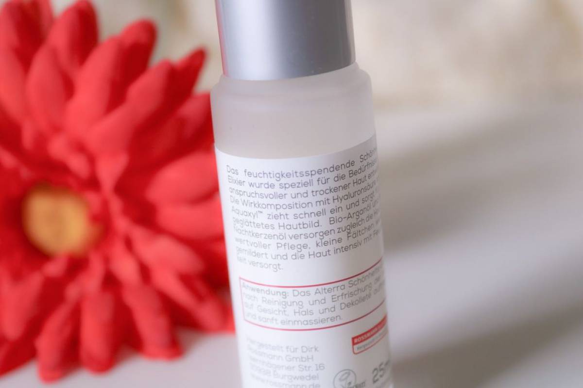 Das Alterra Schönheits-Elixier ist besonders für anspruchsvolle und trockene Haut entwickelt. Die Rezeptur aus Hyaluronsäure sowie Aquaxyl™ mildern die kleinen Fältchen und sichern ein erfrischtes Teint. Die feuchtigkeitsspendende Bio-Arganöl und Bio-Nachtkerzenöl werden schnell in die Haut eingezogen und sorgen für eine tiefe Pflege. Die kleinen Fältchen werden geglättet und die Haut intensiv mit Feuchtigkeit versorgt. Der natürlicher Wirkstoff Aquaxyl™ spendet der Haut sofort und langanhaltend essentielle Feuchtigkeit. Die Synthese der Aquaxyl™ und Hyaluronsäure reguliert und wirkt sich positiv auf die Verteilung des Wassers in der Dermis und Epidermis aus. Die Haut sieht straffer und glatter aus und die Abschuppung von trockener Haut wird reduziert. Das Alterra-Produkt entspricht den strengen NATRUE-Kriterien. Der Produzent versichert, dass diese zertifizierten Naturkosmetik lediglich aus natürlichen Rohstoffen bestehen, die aus biologischen Anbau oder Wildsammlungen stammen. Die Produkte sind nicht parfümiert und enthalten nur natürliche Dufte. Das Alterra Schönheits-Elixier ist absolut vegan und frei von Farb- und Konservierungsstoffen, Silikonen, Paraffinen und anderen Mineralölprodukten. Die Hautverträglichkeit wurde dermatologisch getestet. Die Produkte werden in Deutschland hergestellt.