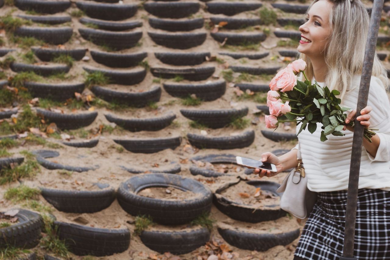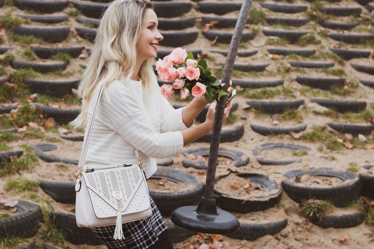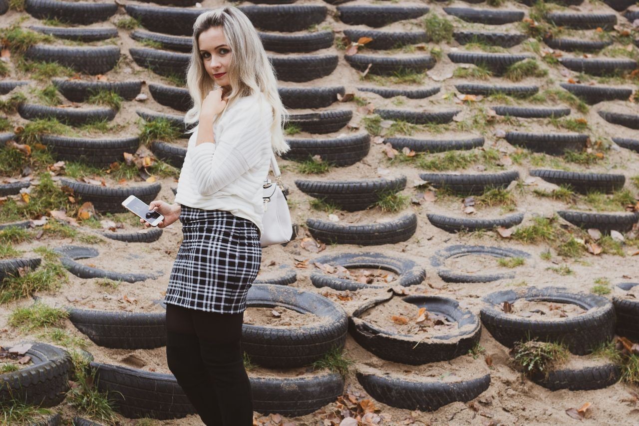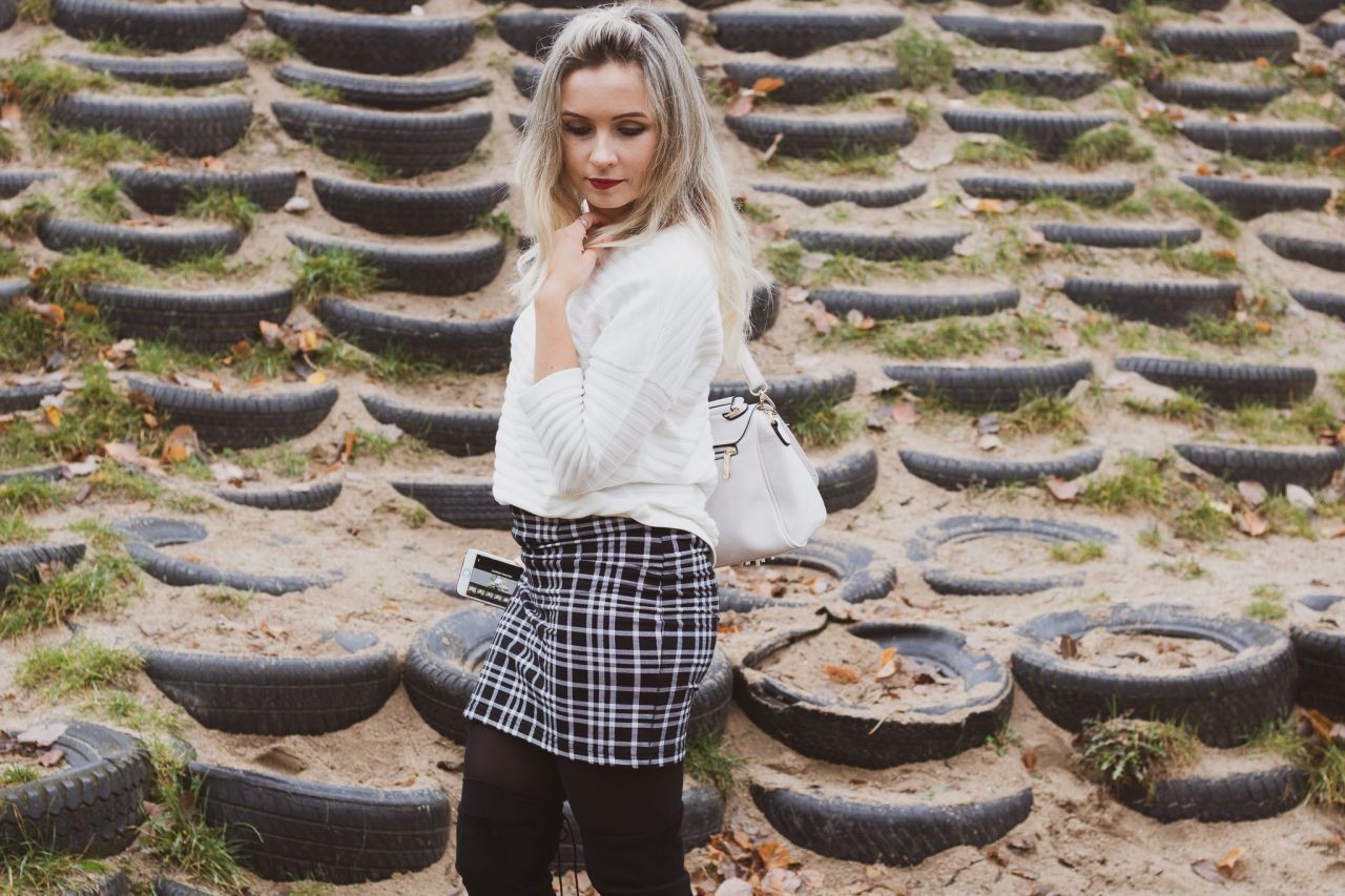 Was das Styling angeht, es ist eine sehr einfache Kombination, weißer Pullover, karierter Rock, Overkneestiefel und darunter schwarze Strumpfhose. Dieses Outfit habe ich von den Mädels auf Instagram abgeguckt :-). Dazu trage ich sehr gerne eine weiße Tasche, die ich im Rahmen einer Kooperation mit Online-Shop Elegrina bekommen habe. Den weißen Pullover habe ich bei Otto bestellt. Leider ist der Pulli nicht merhr verfügbar, aber ich habe sehr ähnliche gefunden - die Verlinkungen findet Ihr unten. Das gleiche gilt für den Rock. Ich liebe diesen Oberteil, da ich es sehr gut mit Röcken kombinieren kann - am liebsten mit engen oder leicht ausgestellten. Dazu passen vor allem in dieser kalten Jahreszeit schwarze Overkneeschuhe. Die Stiefel, die ich auf den Bildern trage, sind bei H&M für EUR 49,99 erhältlich. Die Schuhe habe ich letztes Jahr gekauft und heute sehen immer noch wie neu aus. Die Overkneestiefel sind seit ein Paar Jahren ein echter Trend. Kein Wunder - diese Schuhe sehen so schick aus und zugleich sind sehr praktisch, denn die Beine besser aufgewärmt werden. Ich hoffe mein Vorschlag gefällt Euch :-).