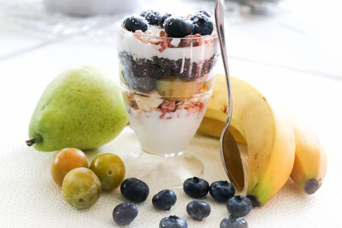 - Abwechseln mit Müsli, Pflaumen, Bananen, Naturjoghurt, Chia-Samen in Gläser oder Schalen schichten.