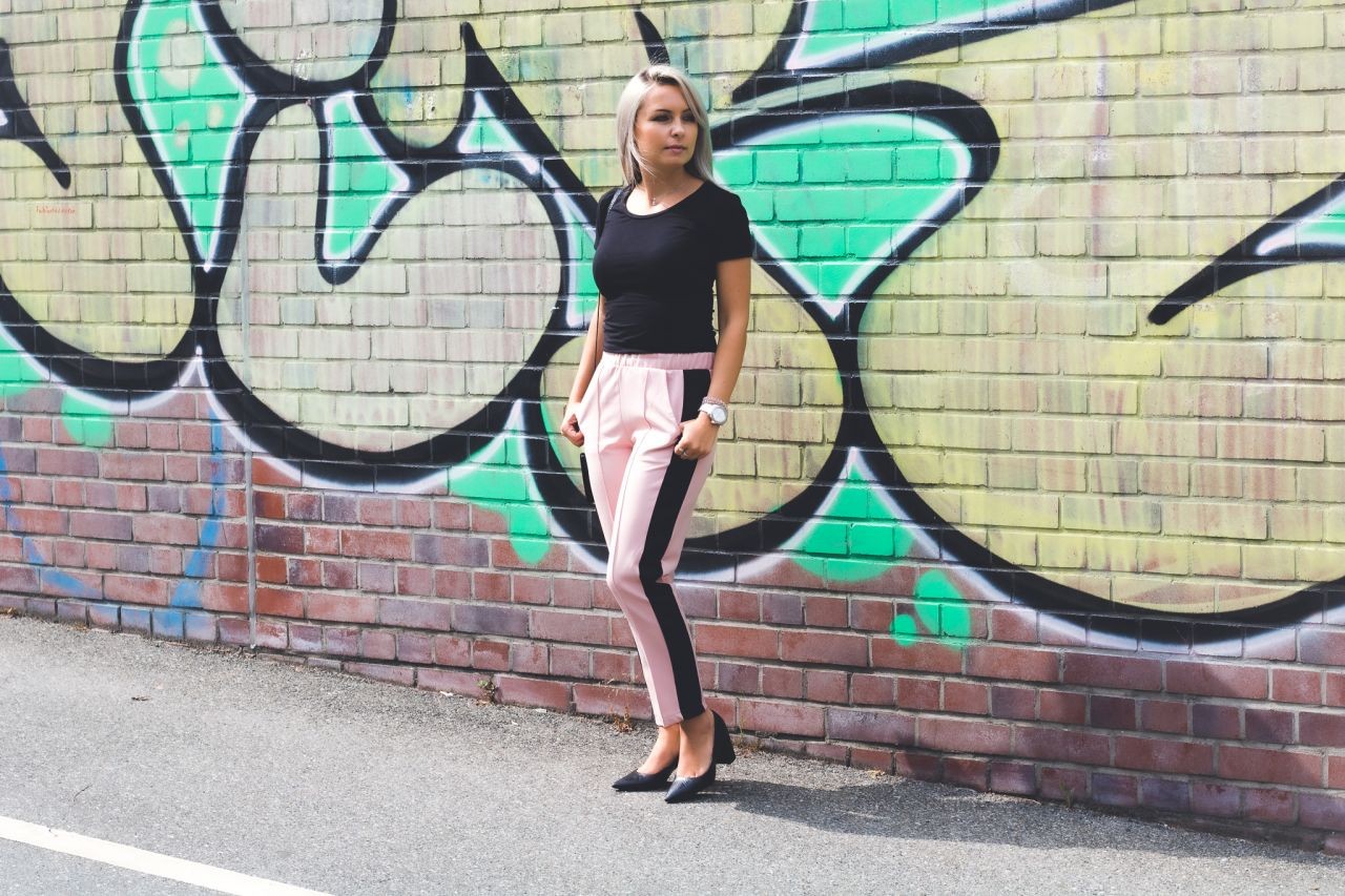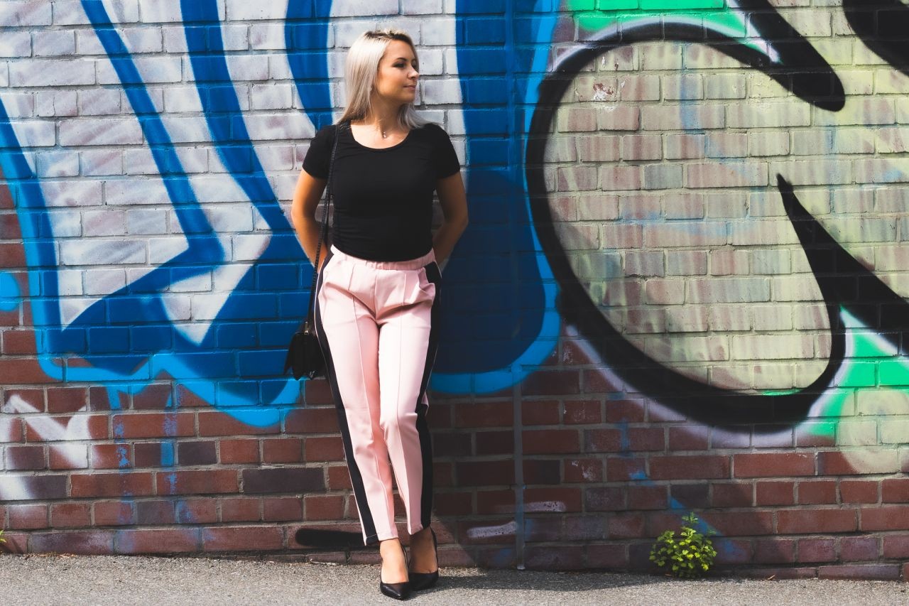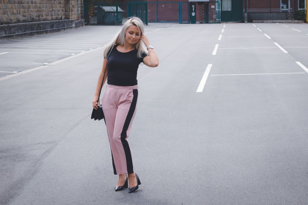 Ich zeige Euch eine weibliche, leicht geschäftliche und elegante Version. Die Hose schätze ich besonders für deren Komfort. Sie ist locker und gleichzeitig durch die Beinfalten elegant. Es ist eine Anspielung auf sportliche Eleganz. Die Seitenstreifen machen diesen Garderobenteil noch interessanter und können wir sicher sein, dass wir perfekt zu den neuesten Trends passen. Outfits mit solchen Hosen funktioniert auch bei offiziellen Anlässen. Der Oberteil darf bei solchem Styling nicht übertrieben sein und deswegen würde ich mich eher für die Basics entscheiden, sodass die Hose im Vordergrund bleibt.