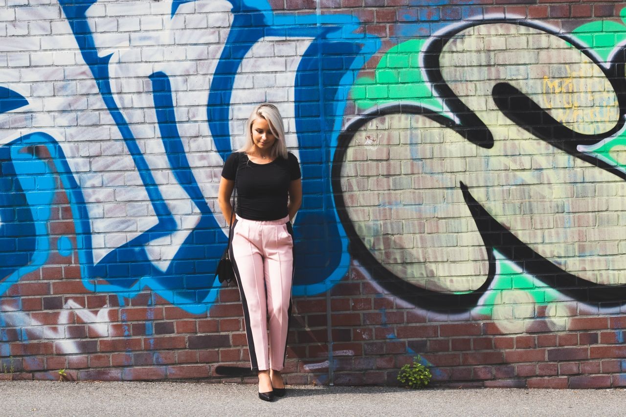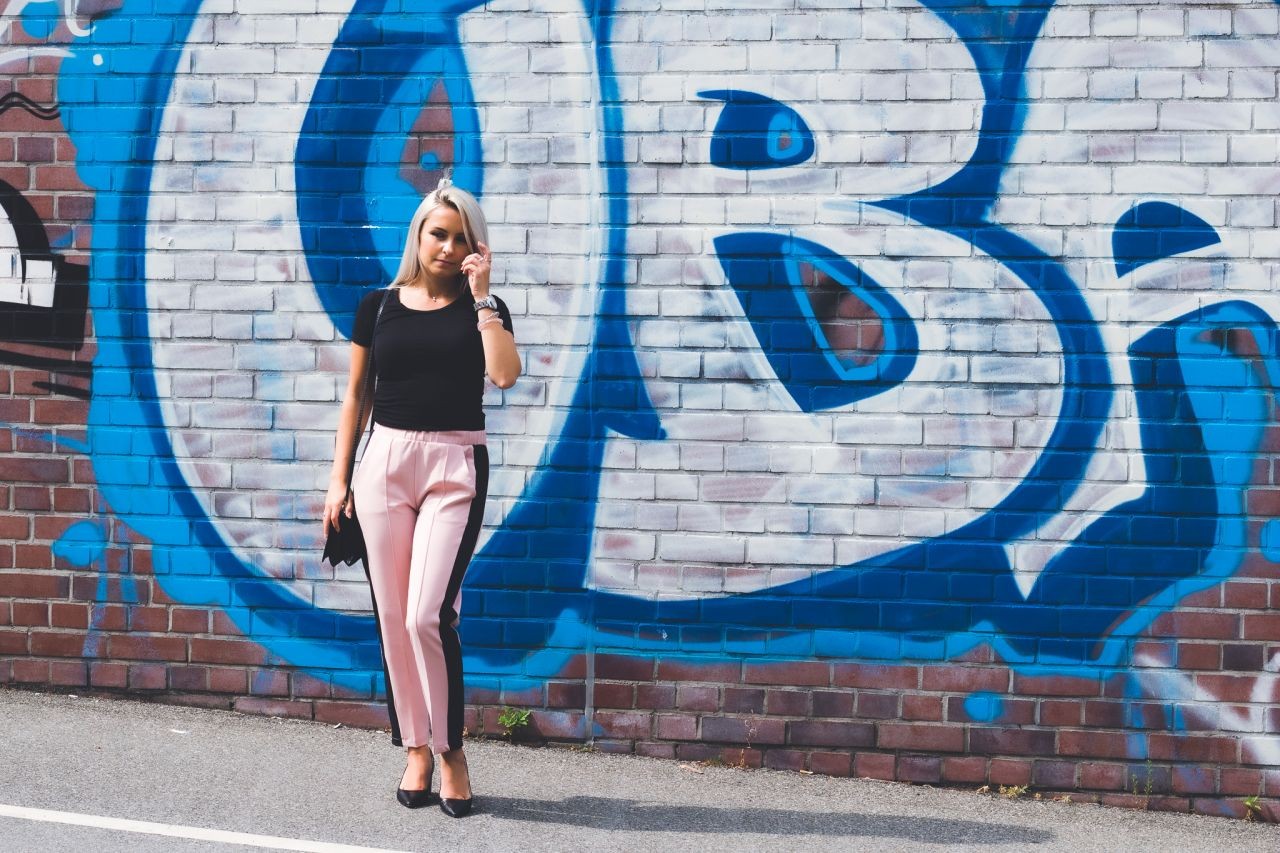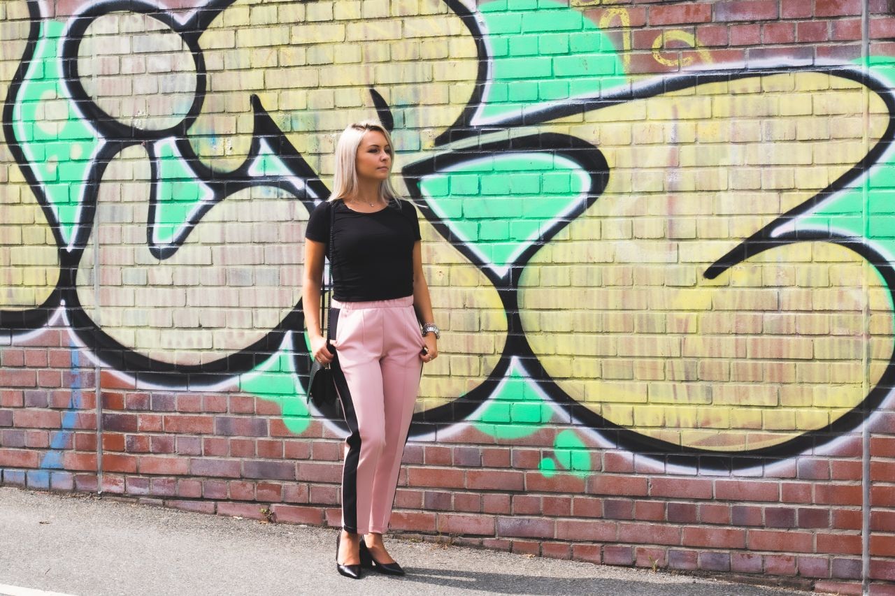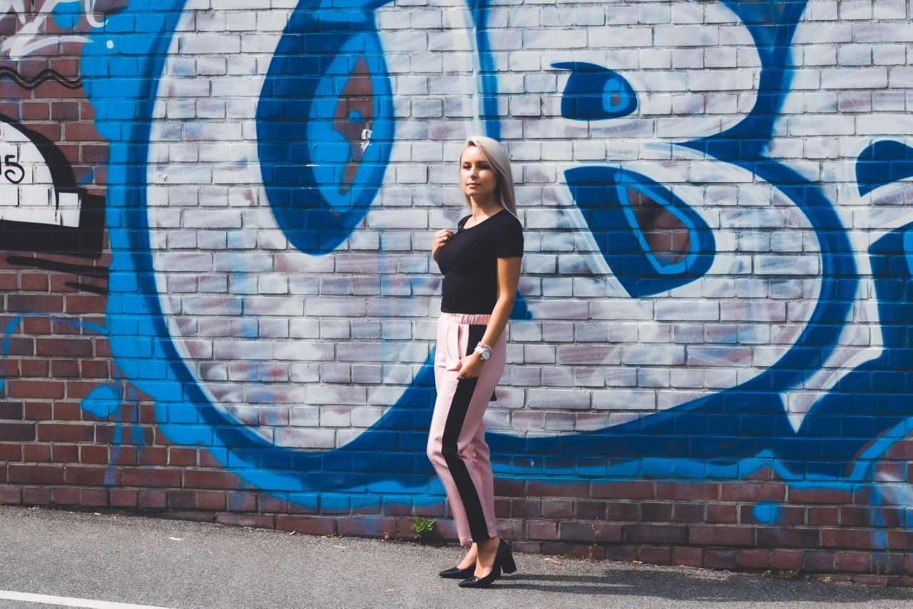 Ich zeige Euch eine weibliche, leicht geschäftliche und elegante Version. Die Hose schätze ich besonders für deren Komfort. Sie ist locker und gleichzeitig durch die Beinfalten elegant. Es ist eine Anspielung auf sportliche Eleganz. Die Seitenstreifen machen diesen Garderobenteil noch interessanter und können wir sicher sein, dass wir perfekt zu den neuesten Trends passen. Outfits mit solchen Hosen funktioniert auch bei offiziellen Anlässen. Der Oberteil darf bei solchem Styling nicht übertrieben sein und deswegen würde ich mich eher für die Basics entscheiden, sodass die Hose im Vordergrund bleibt.