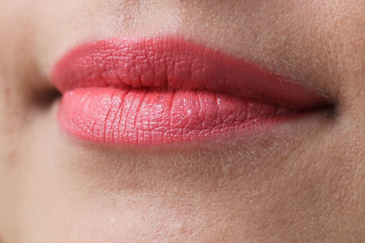 Dieser Farbton ist etwas zwischen Korall gemischt mit leichtem Orange. Es präsentiert sich wirklich schön auf den Lippen.