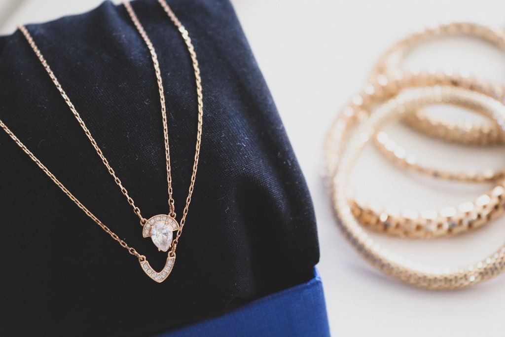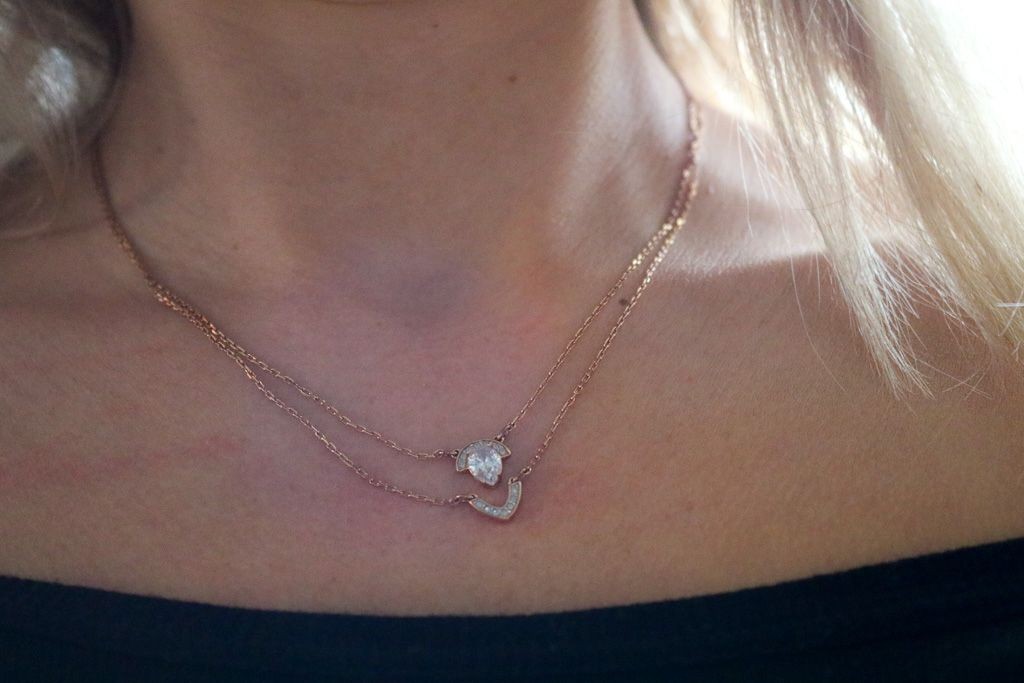 Ich muss zugeben, dass ich Schmuck um meinen Hals nie besonders gerne getragen habe. Ich dachte immer, dass kurze Ketten den Hals optisch verkürzen würden. Erst in der letzten Zeit bin ich von Halsketten überzeugt. In roségold trage ich am liebsten die Halskette Layer von Swarovski. Ich mag diese Marke sehr. Die 2-er Halskette mit aufeinander passenden Anhänger präsentiert sich richtig hübsch und elegant auf dem Dekolletee. Die Länge lässt sich verstellen, so dass man sie kurz und länger tragen kann. Ich habe dazu eine Verlängerung, die ihr im jeden Swarovski-Geschäft bekommt. Damit kann ich mit Länge umso besser variieren.