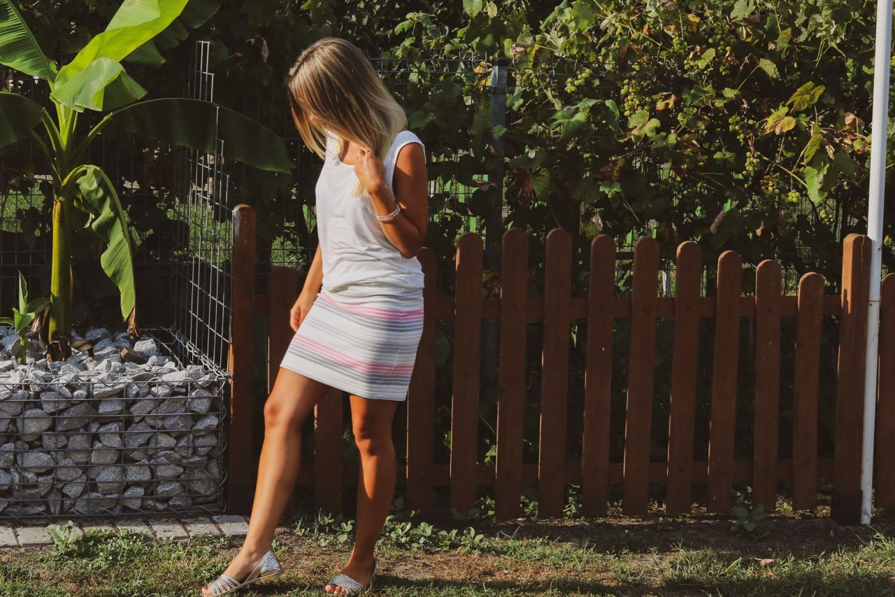 Der weiße Rock mit rosa-grauen Streifen ist relativ kurz. Wegen der Farbkomposition und der Länge eignet sich dieser Kleiderstück eher für warme Sommertage. Ich würde es mit den Oberteilen in den Farben, die auf dem Rock vorhanden sind, kombinieren - d. h. weiß, rosa und grau. Die restlichen Klamotten würde ich nur in einer Farbe wählen. Die Regel ist, dass Muster entweder auf der Bluse oder auf dem Rock vorkommen können. Die zweite Regel lautet - nie Punkte und Streifen mit Blumen und anderen großen Motiven kombinieren ;).