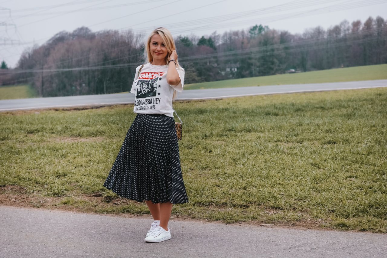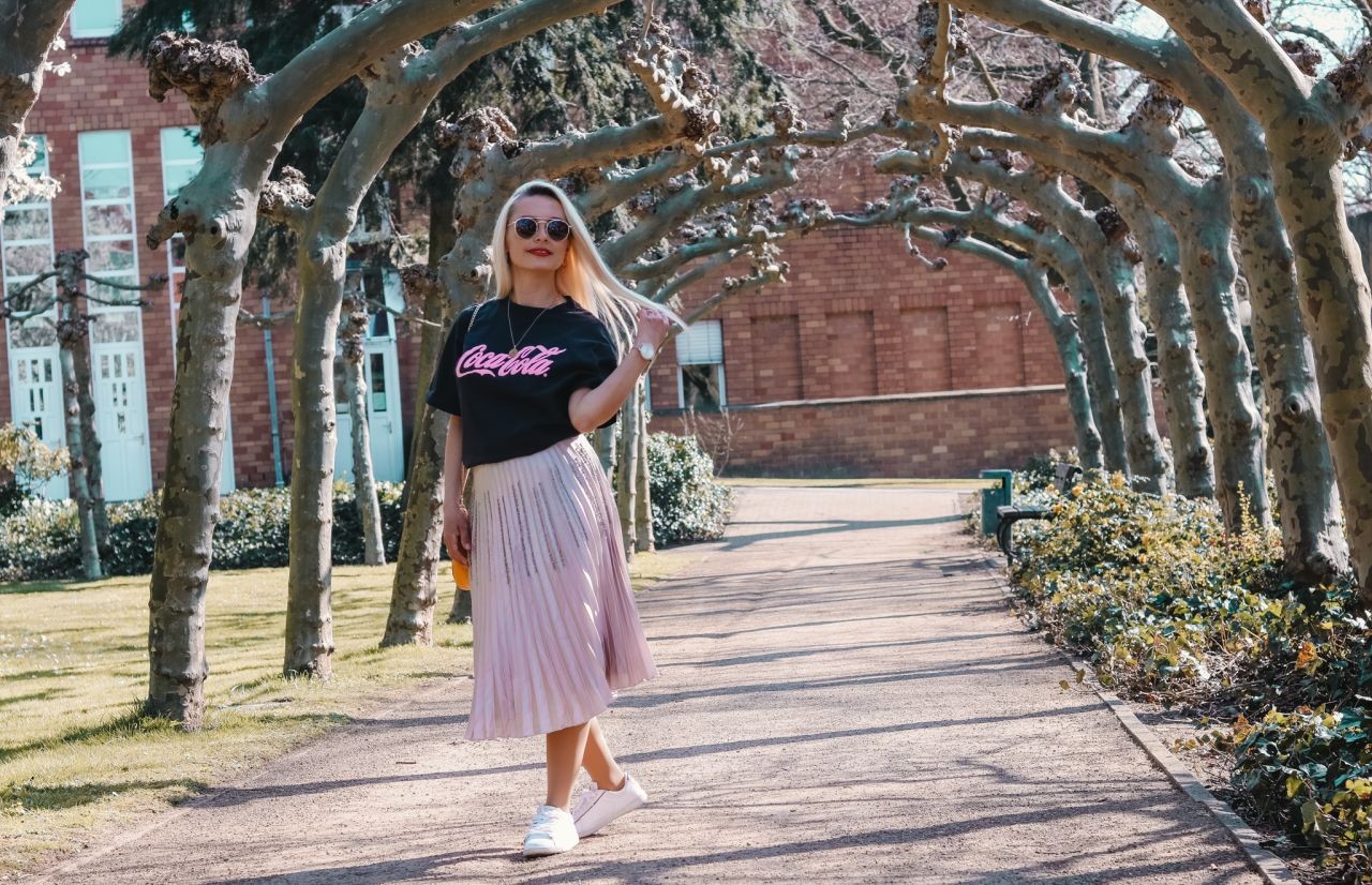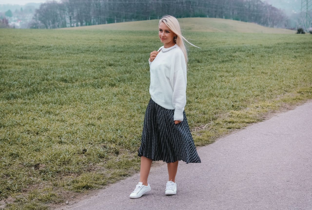 Plisseeröcke sind zurückgekehrt und haben die Herzen von Designern und Modeliebhabern auf der ganzen Welt erobert. Sie sind seit mehreren Saisons beliebt und es sieht nicht danach aus, dass das Garderobenstück aus der Mode kommt. Erhältlich in verschiedenen Längen (Maxi, Midi) und Farben ist ein Faltenrock so universell, dass es eine Basis für viele Styles darstellt. Ein Faltenrock ist das ganze Jahr über ein anspruchsvoller Trend! Sie werden im Sommer, Frühling, Herbst und Winter getragen. Es hängt alles davon ab, womit wir es anziehen. Sie werden nicht nur elegant, sondern auch sportlich kombiniert. In einer eleganten Edition sieht ein Plisseerock toll mit einer Bluse und Pumps aus. Solche Varianten habe ich euch bereits in einem Blogartikel gezeigt (dazu Link unten). Meine Lieblingskombination mit dem Garderobenteil ist jedoch momentan sportlich. Im Frühling verbringen wir gerne Zeit draußen, gehen spazieren, treffen uns mit den Freunden, grillen etc. Deswegen ist es für mich wichtig mich wohl zu fühlen. Dafür sorgt eine bequeme Kleidung mit viel Bewegungsfreiheit. Durch den leichten Stoff erfüllen die Plisseeröcke diese Kriterien und zugleich kreiere ich einen originellen Look.
