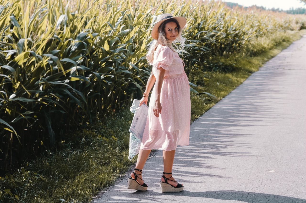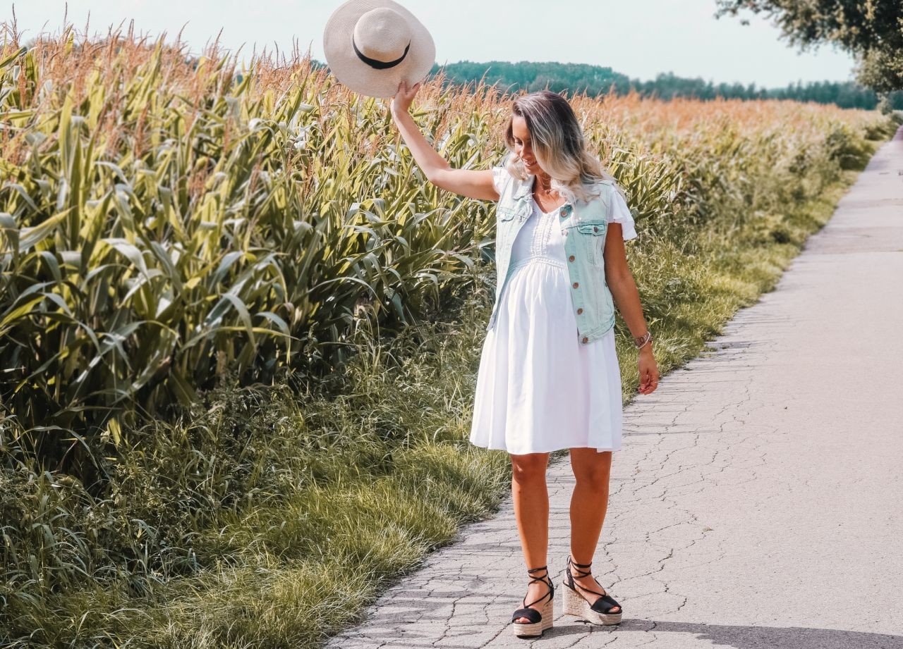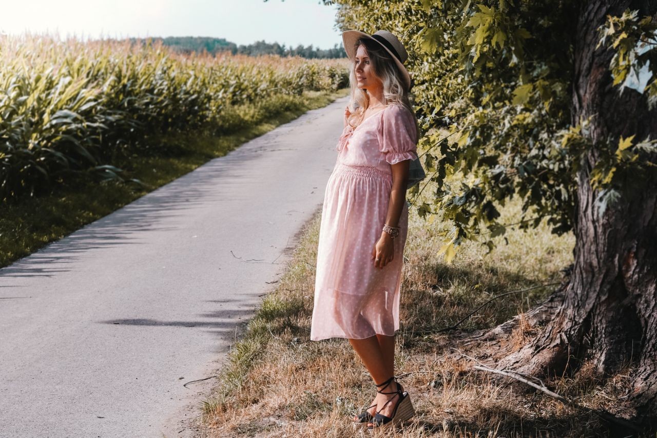 Das Kleid ist unterhalb der Brust mit einem Band tailliert und lässt durch viel Stoff genug Freiraum für den Bauch. V-förmiger Ausschnitt und süße kurze Puffärmel verleihen dem Kleid einen verspielten und romantischen Flair und einen femininen Look. Für Spaziergänge in der Natur oder Treffen mit Freunden setzte ich zusätzlich den Strohhut auf, den ihr schon aus dem vorherigen Outfit kennt. Dazu passen wiedermal meine schwarzen Sandalen mit Keilabsatz und Schnürbändern.