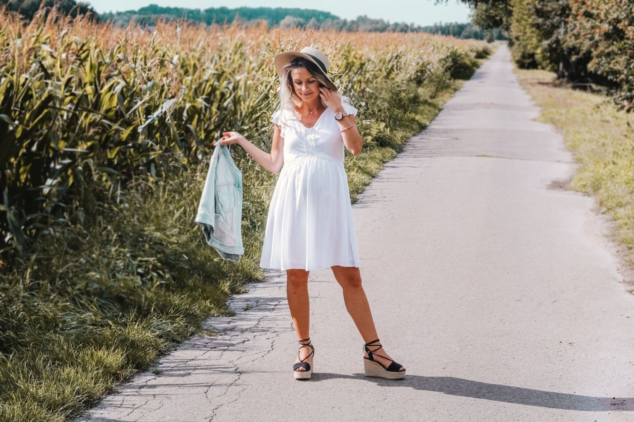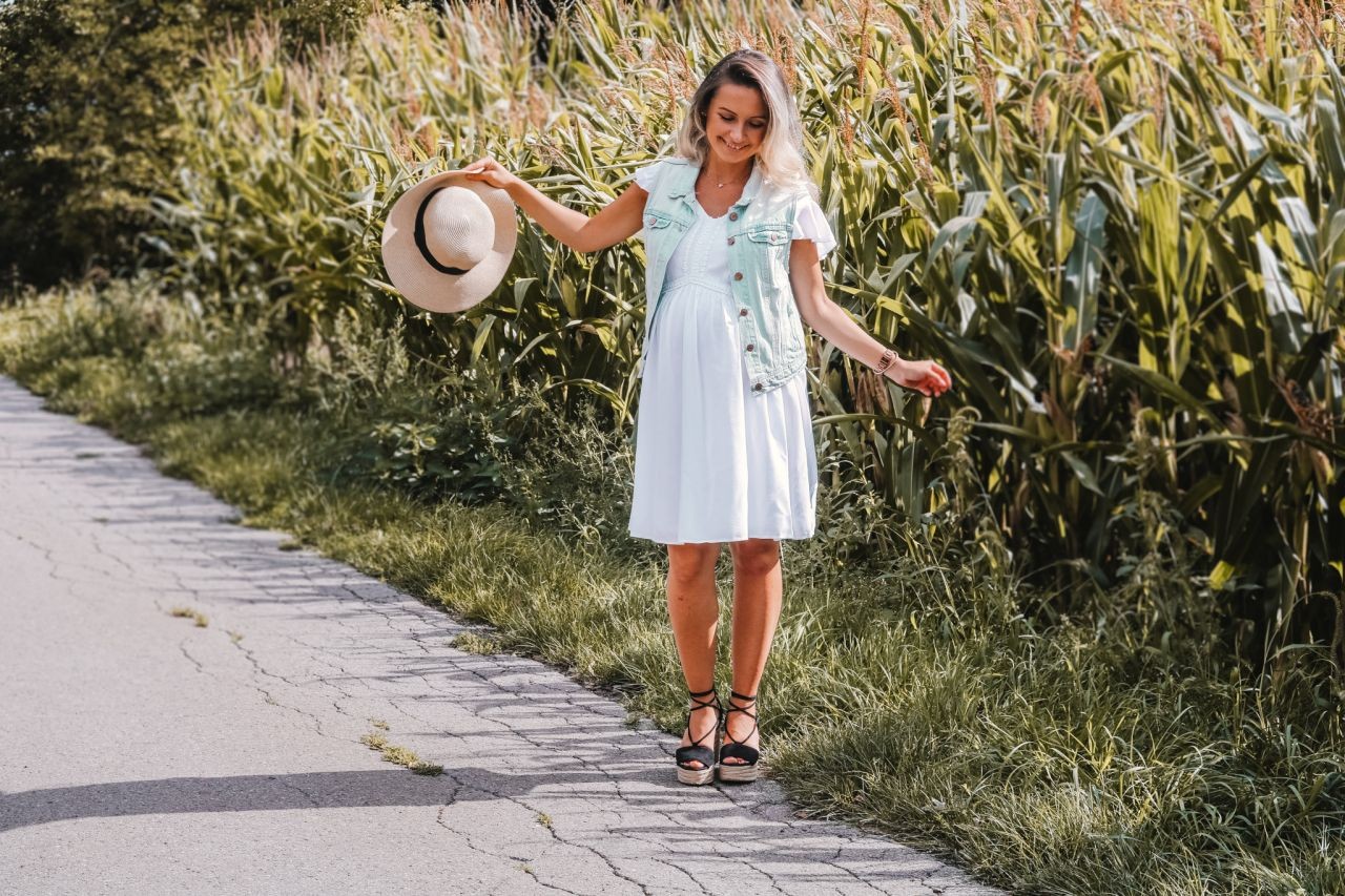 Das nächste Outfit ist mein absoluter Favorit. Das weiße Kleid von Vintage tailliert unter der Brust fällt locker auf meinen schwangeren Bauch. Leichter Stoff eignet sich perfekt für die Schwangerschaft. V-Ausschnitt mit dekorativer Naht und leicht fallende kurze Ärmel machen den gesamten Look sehr feminin, süß und mädchenhaft. Ich kombiniere das Outfit mit einer hellen Jeansweste, die ich ebenfalls bei Zadaa ergattert habe. Auf die Weste habe ich mich besonders gefreut. Ich muss zugeben, dass ich es sehr oft trage, denn es lässt sich super mit verschiedenen Garderobenteilen wie Hosen, Kleidern oder Röcken kombinieren. Die Outfits sehen durch den kleinen Zusatz viel origineller aus - genauso wie mein weißes Kleid.