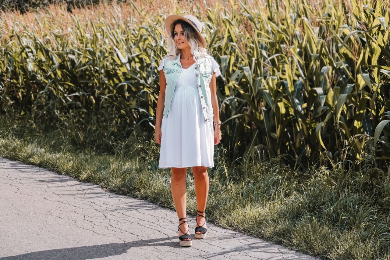 Weißes Kleid mit Jeans-Weste und Strohhut