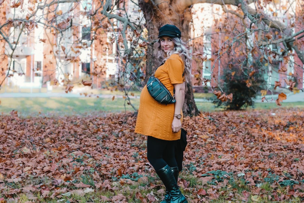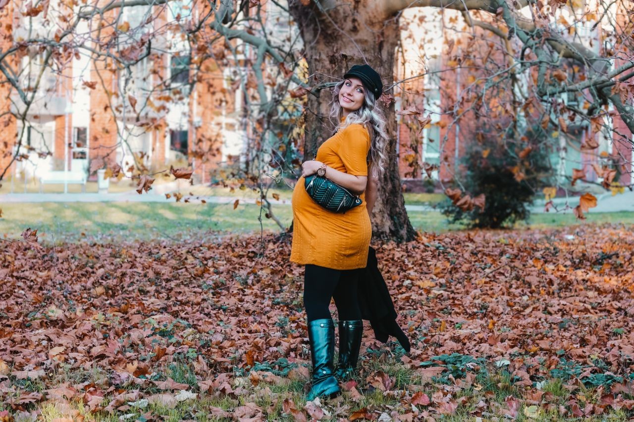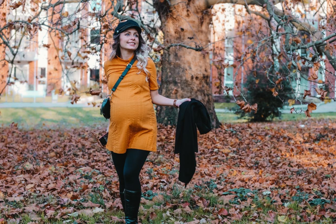 Mein Herbstoutfit ist ein Vorschlag für den Alltag. Das Kleid in Gelbsenf ist aus dehnbaren Stoff, sodass es sich perfekt für meinen schwangeren Bauch eignet. Die enge Form des Kleides lässt mich gleichzeitig nicht zu dick aussehen. Ich habe gemerkt, dass zu breite Oversize-Maxi-Kleider mich zu dick machen. Es hat die Auswahl der Kleider in meinem Schrank sehr beschränkt. Das Kleid ist ideal für die Schwangerschaft. Es ist sichtbar, dominiert aber nicht das gesamte Styling. Es ist auch bequem und kann auf verschiedene Weise gekleidet werden. Ich habe mich für die casual Version entschieden.