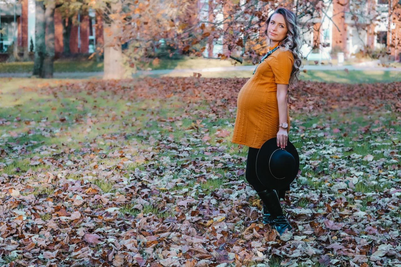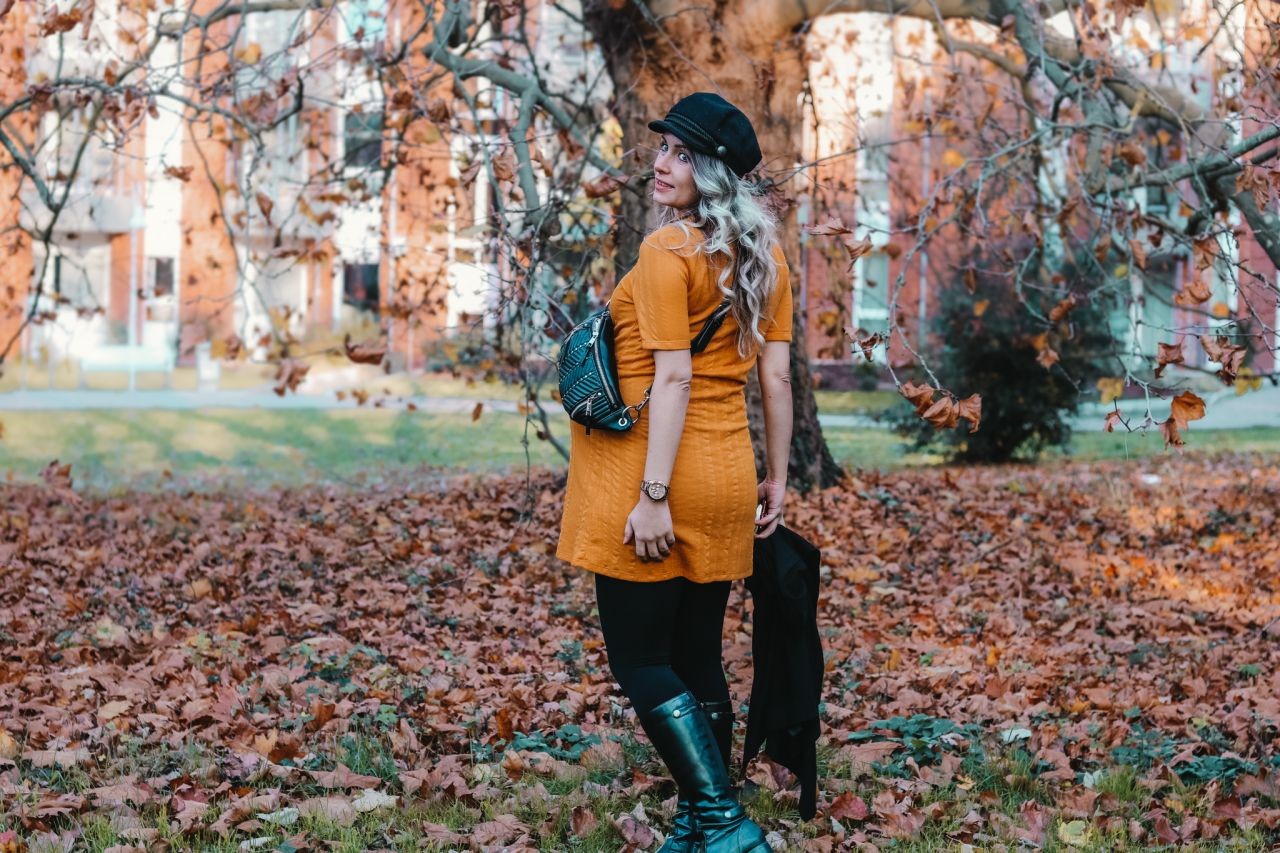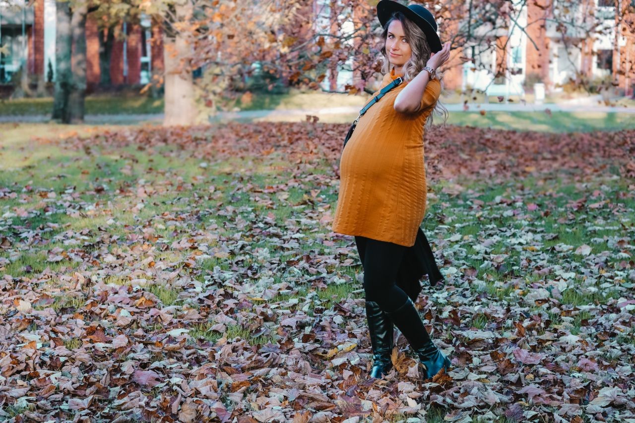 Mein Herbstoutfit ist ein Vorschlag für den Alltag. Das Kleid in Gelbsenf ist aus dehnbaren Stoff, sodass es sich perfekt für meinen schwangeren Bauch eignet. Die enge Form des Kleides lässt mich gleichzeitig nicht zu dick aussehen. Ich habe gemerkt, dass zu breite Oversize-Maxi-Kleider mich zu dick machen. Es hat die Auswahl der Kleider in meinem Schrank sehr beschränkt. Das Kleid ist ideal für die Schwangerschaft. Es ist sichtbar, dominiert aber nicht das gesamte Styling. Es ist auch bequem und kann auf verschiedene Weise gekleidet werden. Ich habe mich für die casual Version entschieden.