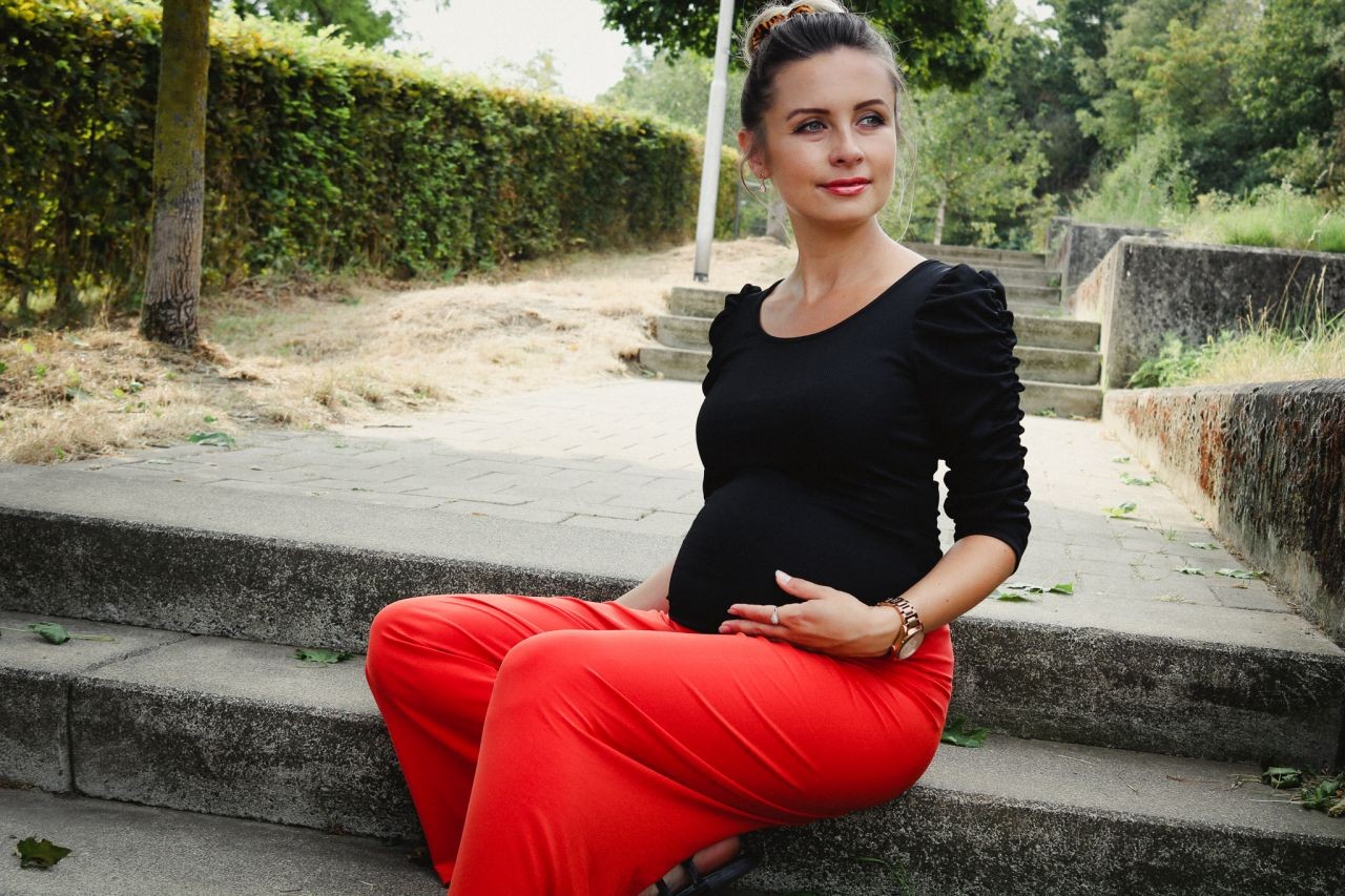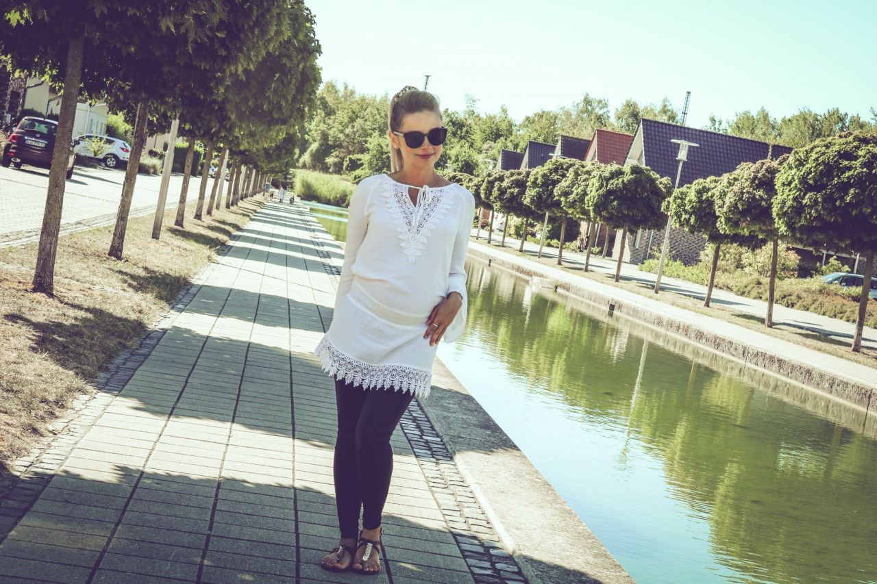 Mein schwarzes Kleid in Oversize Form ist aus sehr leichtem Stoff, der angenehm auf der Haut liegt. Ich bin stolz auf meinen Bauch und zeige es gerne, was nicht schwierig ist, denn er lässt sich nicht mehr verstecken :). Deswegen unterstreiche ich die schöne Rundung mit einem schmalen Gürtel unter der Brust.Mögt Ihr lockere Tuniken und Blusen? Dann habt Ihr wahrscheinlich genug solche Modelle in Eurem Kleiderschrank. Sie eignen sich hervorragend anstelle typischer Umstandsmode. Ich trage beispielsweise sehr gerne Longtuniken und Oversize-Shirts und kombiniere sie mit Leggings. Solche Hose (auch als Umstandsleggings) sollte in der Garderobe einer jeden zukünftigen Mama nicht fehlen. Ich glaube, es wird meine einzige Investition sein, wenn es um die Umstandsmode geht. Momentan trage ich noch meine alte Leggings, jedoch bald wird es nicht mehr reichen. Außerdem sie wird auch nach der Geburt nützlich sein, wenn ich wahrscheinlich immer noch wie in 4–5 Monat aussehen werde. Außerdem ist die Hose so vielseitig einsetzbar und kann sehr gut mit Sportschuhen, Ballerinas oder eleganten Sandalen kombinierbar sein; Ihr könnt sie in einem Restaurant oder den ganzen Tag auf der Couch tragen.