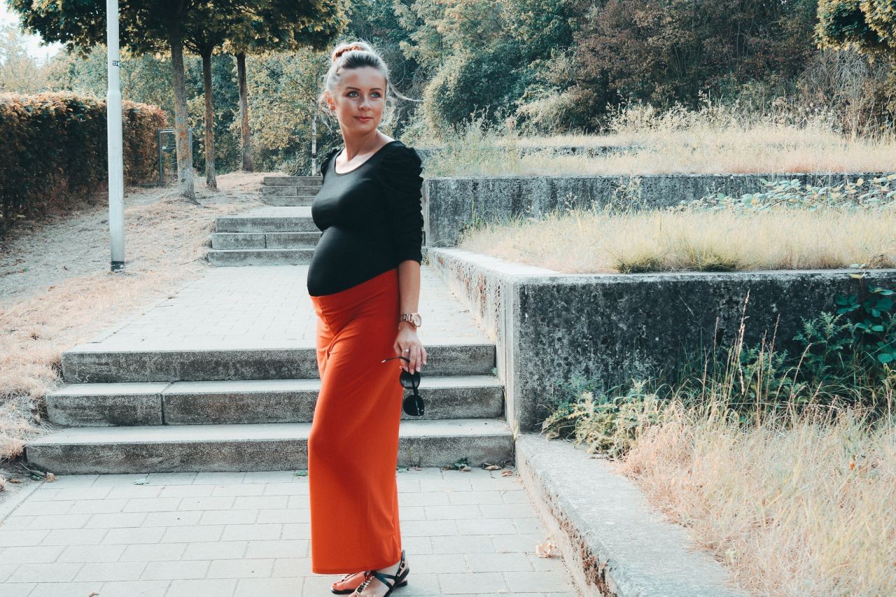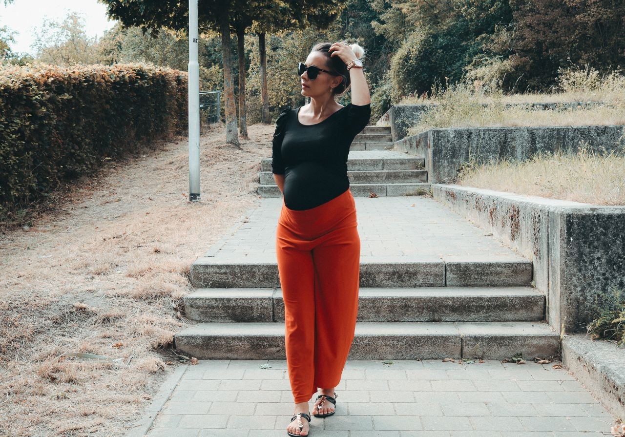 Aber zurück zu meinen Culottes in Orange. Die knallige Farbe ist perfekt für Sommer und passt zu vielen anderen Farbtönen. Wenn es um Oberteile geht, die Auswahlmöglichkeiten sind sehr vielseitig, denn Ihr könnt sowohl enge als auch etwas lockere Shirts anziehen. Ich habe mich für einen engen und elastischen Body in Schwarz entschieden. Es unterstreicht super den runden Bauch. Dazu trage ich schwarze Sandalen und peppe das Outfit mit einem bunten Haarband mit orange Elementen auf.