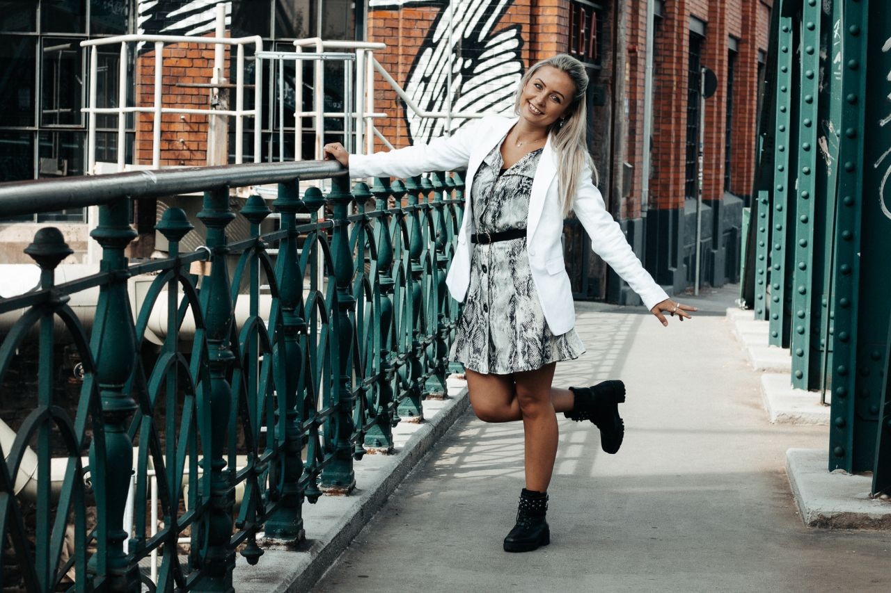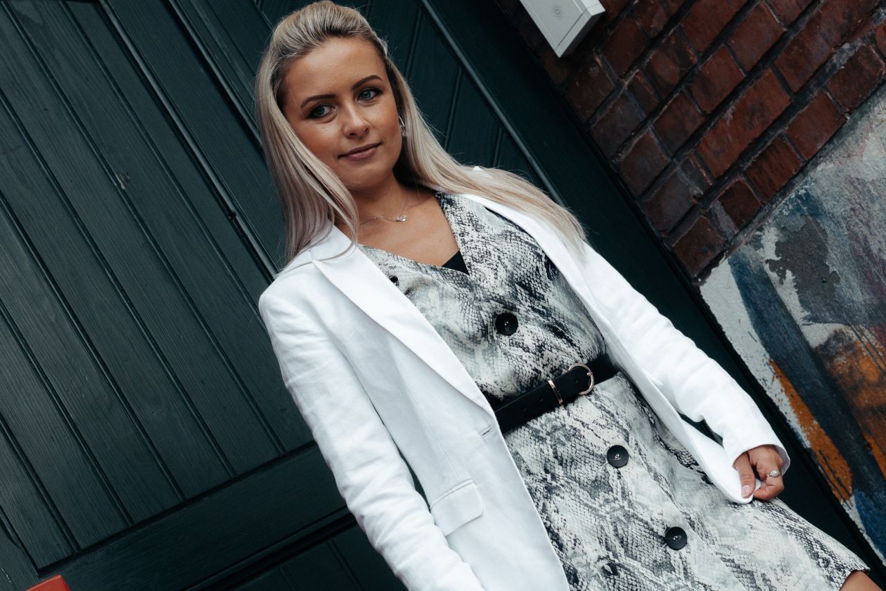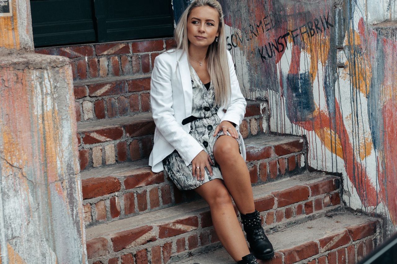 Der weiße Blazer stellt eine tolle Ergänzung zu dem Snake Kleid. Damit kreiere ich einen schönen Office-Look. Statt den Biker-Boots werde ich sicherlich das Outfit mit Pumps anziehen und das Outfit zu einem Abend-Look kreieren. So vielfältig ist der Animalprint.
