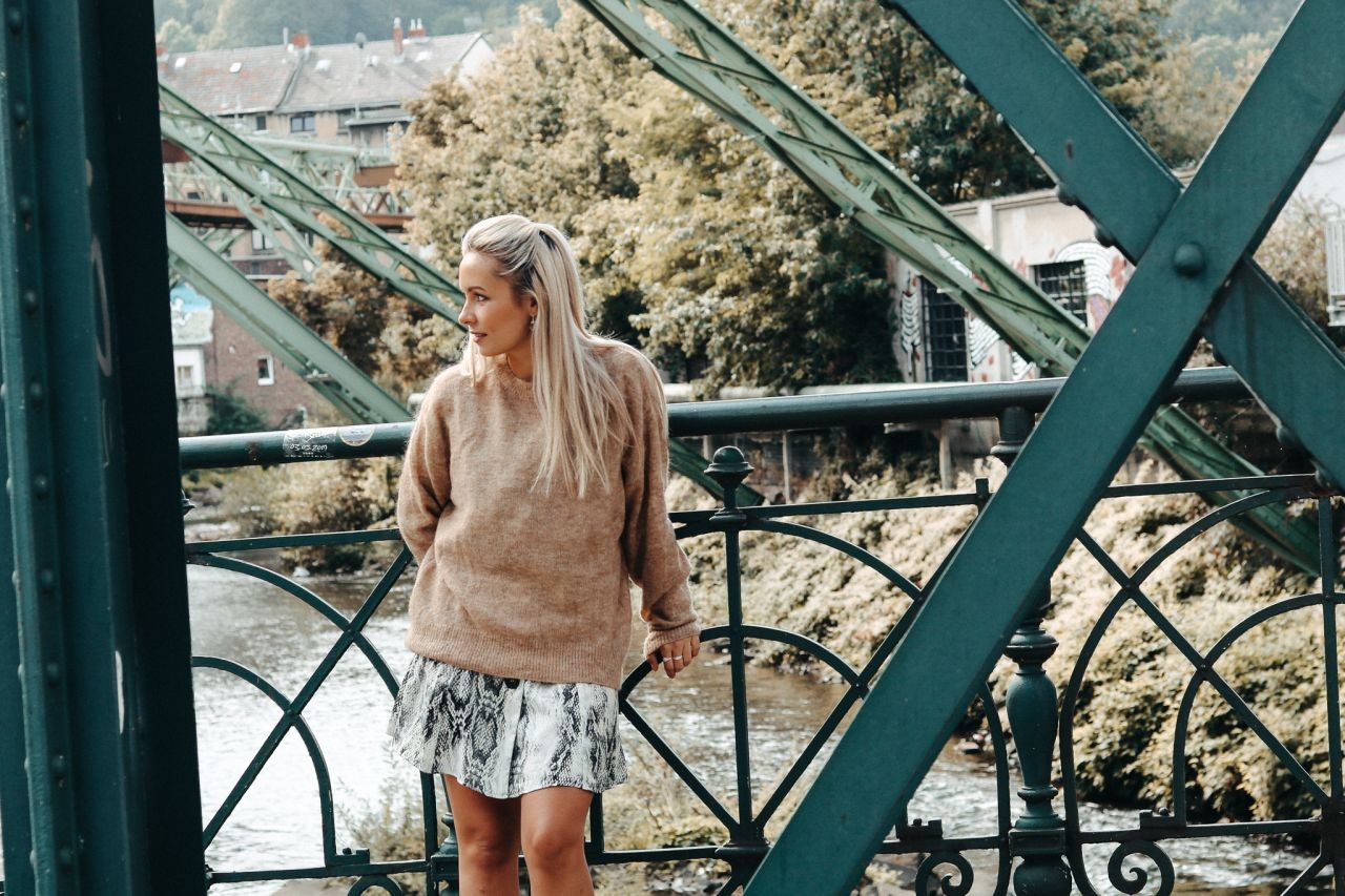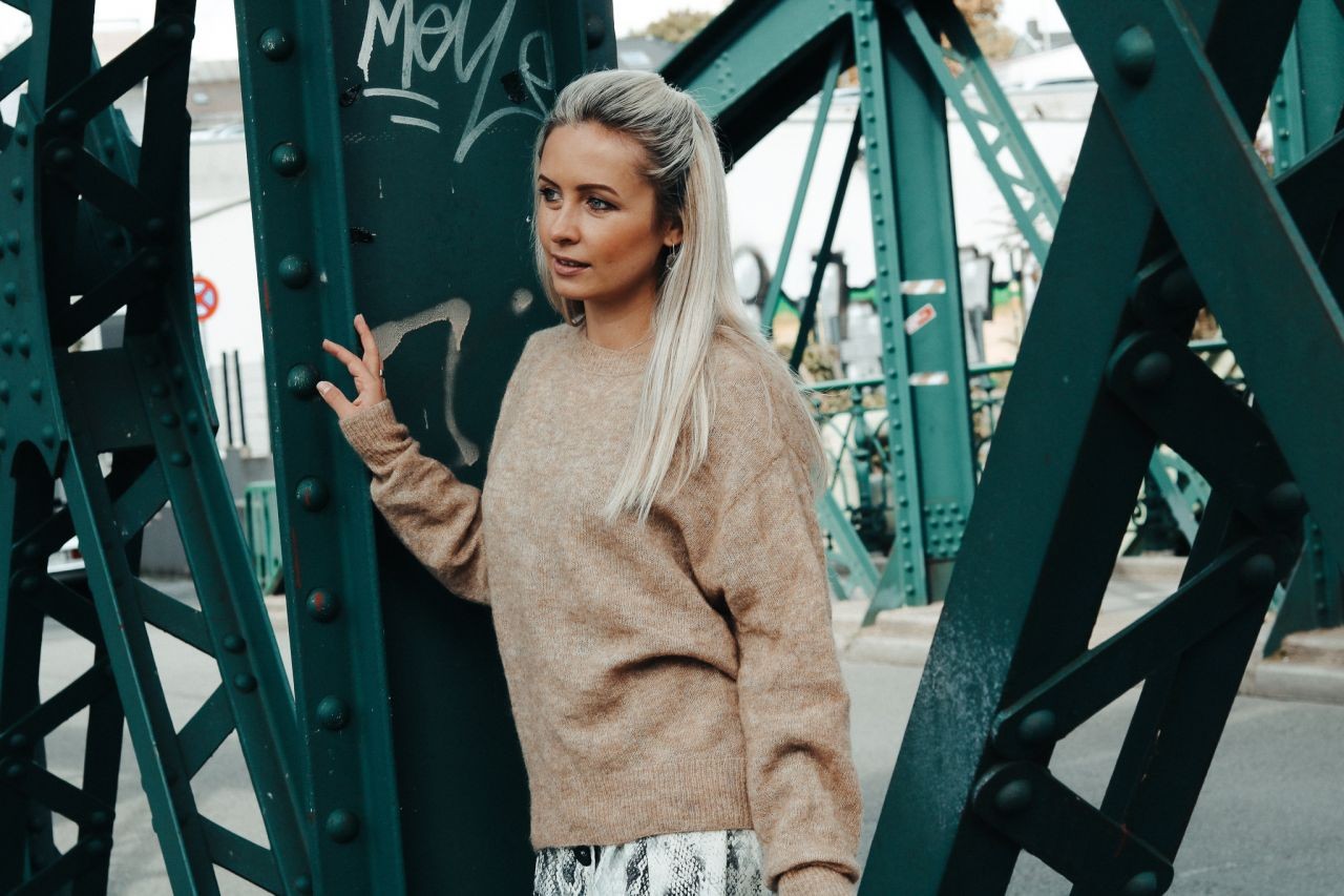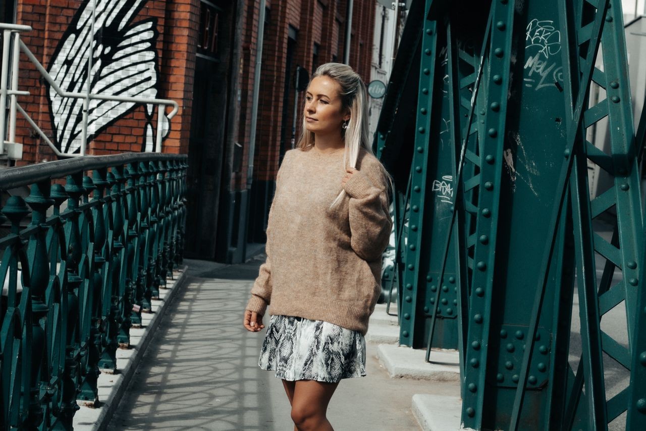 Die zweite Variante ist meiner Meinung nach am besten für den Alltag geeignet. Der beige Pullover macht das gesamte Outfit zu einem Wohlfühl-Look. Es ist eine lockere und legere Kreation und passt perfekt zu denjenigen, die es gerne gemütlich und nicht eng haben möchten. Wie ich schon oben erwähnt habe, Beige ist eine Farbe, die sehr gut mit dem Schlangenmuster kombiniert werden kann.