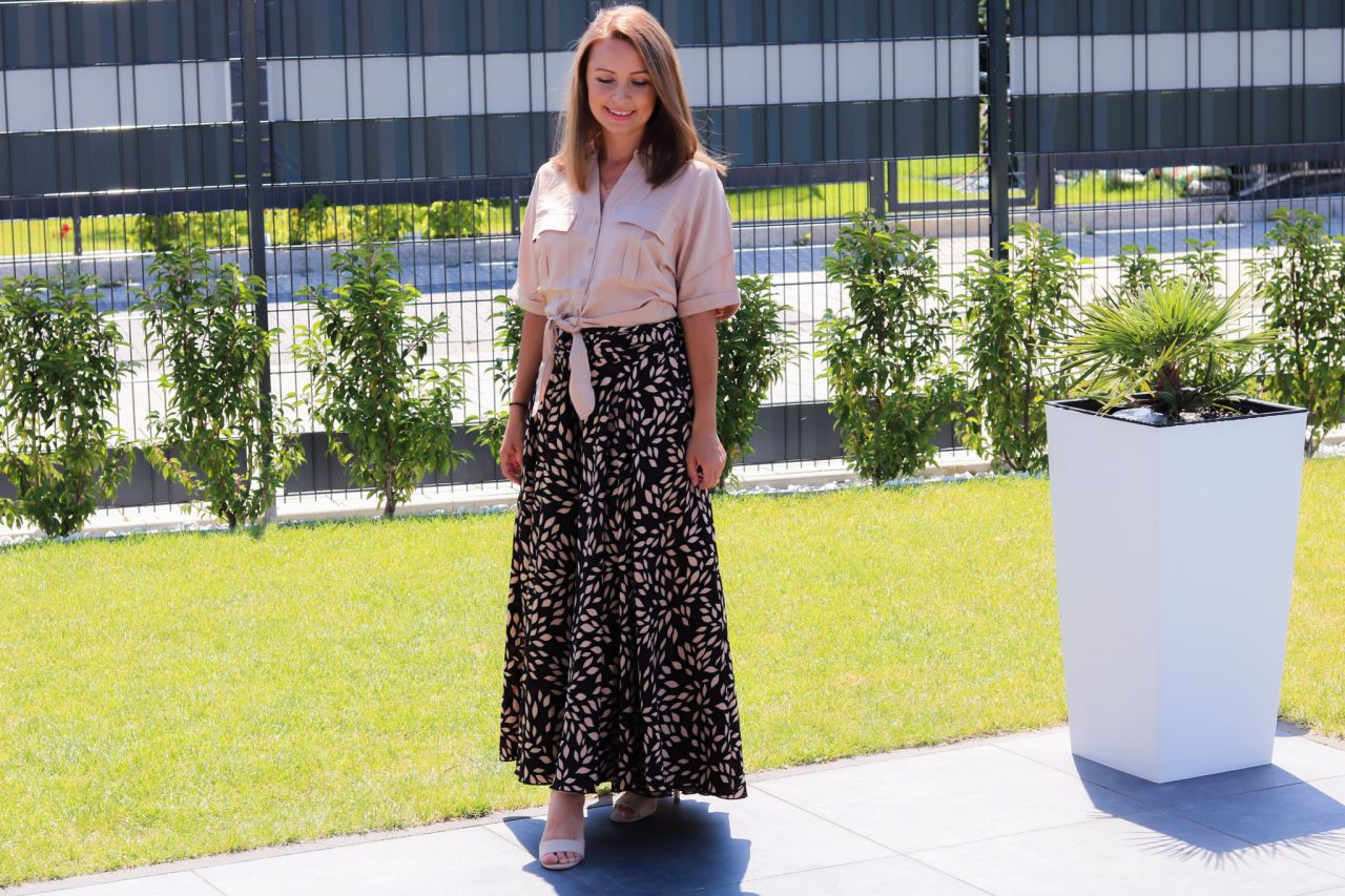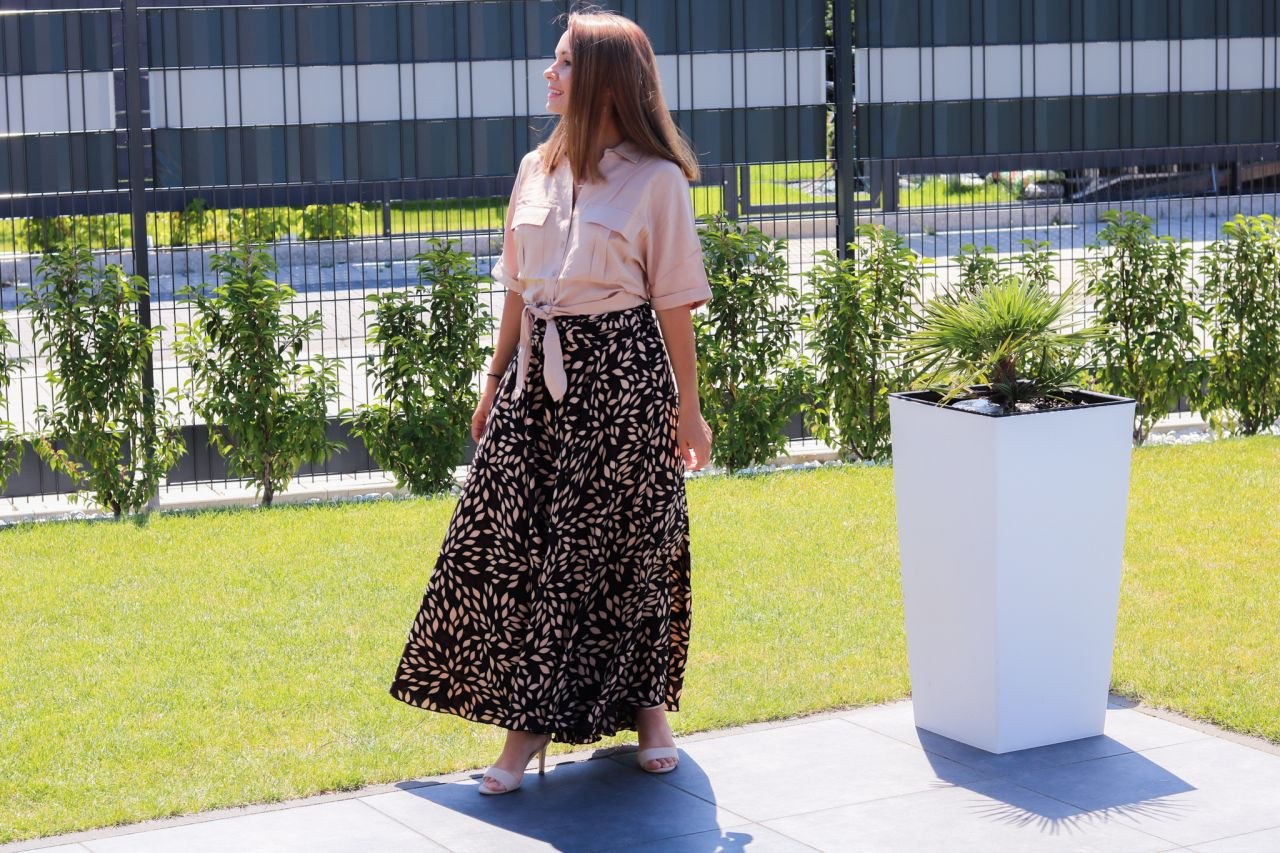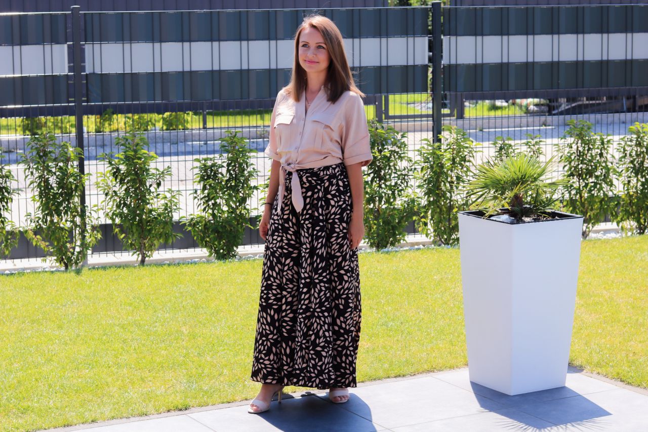 Der Hosenrock von Lascana in meinem nächsten Look stellt einen absoluten Hingucker dar. Ich muss sagen, dass das Kleidungsstück zu den besonderen Teilen in meiner Garderobe gehört. Die Hose sieht nicht nur stylisch aus, sondern auch durch das leichte und locker fallende Material sehr angenehm zu tragen ist. Die Muster in Beige/Braun und der Schnitt sorgt für einen sofortigen Blickfang. Dazu kombiniere ich eine Kurzarmbluse mit Knotendetail in Beige ebenfalls von Lascana. Die überschnittenen Schultern sehen sehr lässig aus und der Bund in der Bauhöhe unterstreicht die Taille. Es ist ein Outfit mit Wow-Effekt und gehört definitiv zu meinen Favoriten.