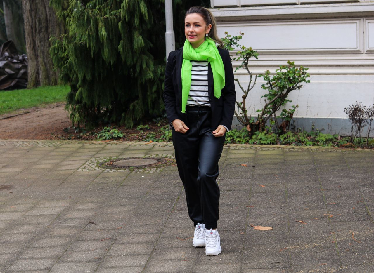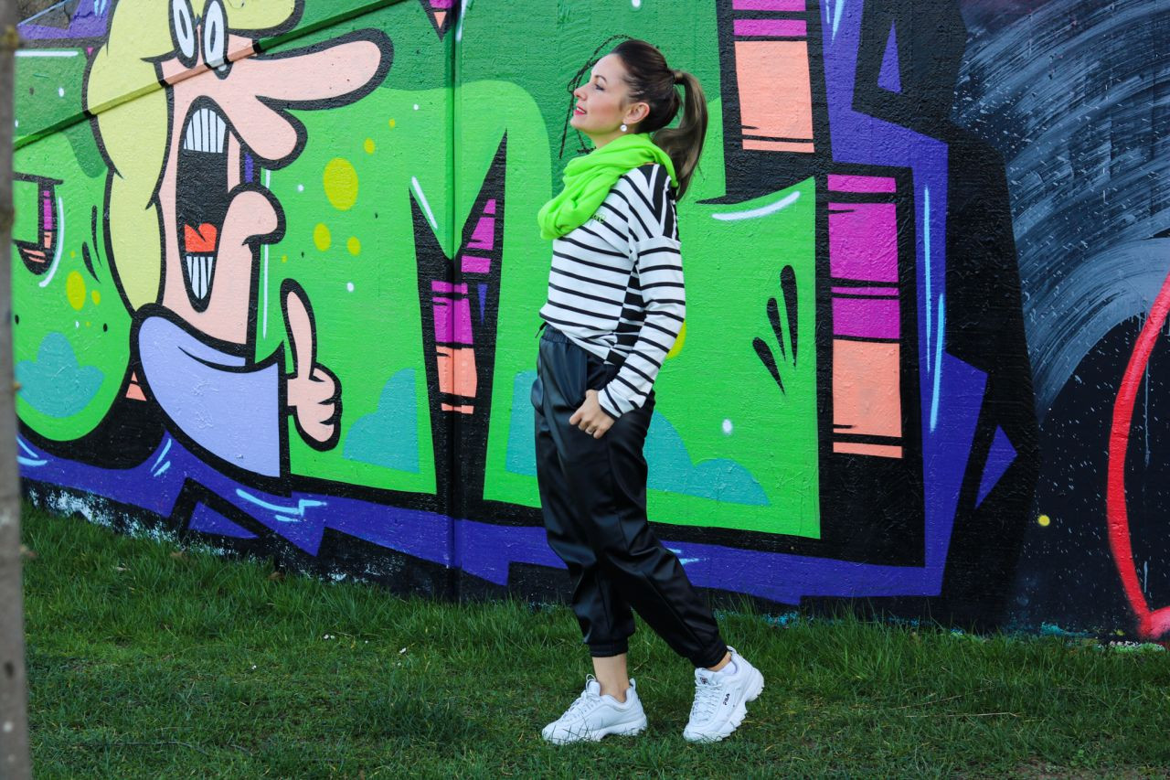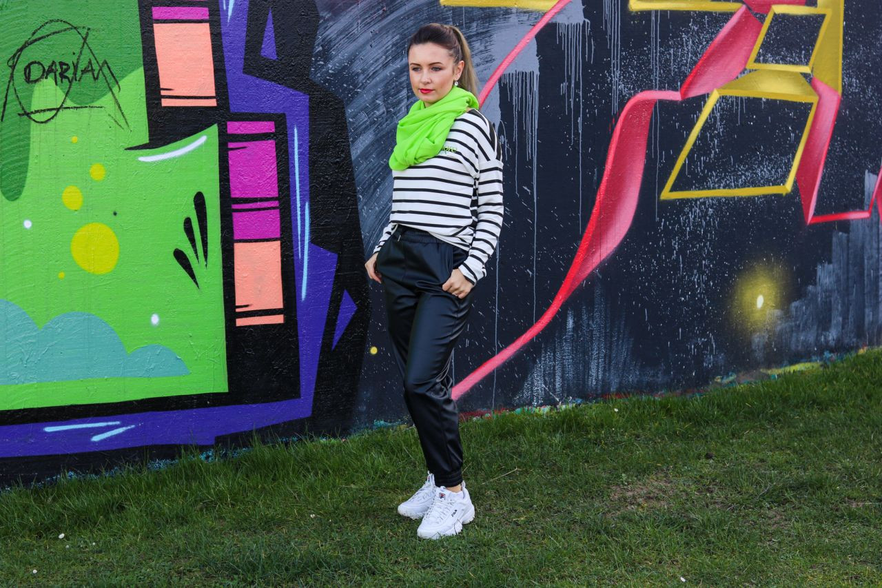 Der Look gefällt mir sehr gut liebe Alice. #Streifengehenimmer. Sehr hübsches Tuch in Neon dazu und die Jogginghose ist klass. Ich mag den Streetstyle.