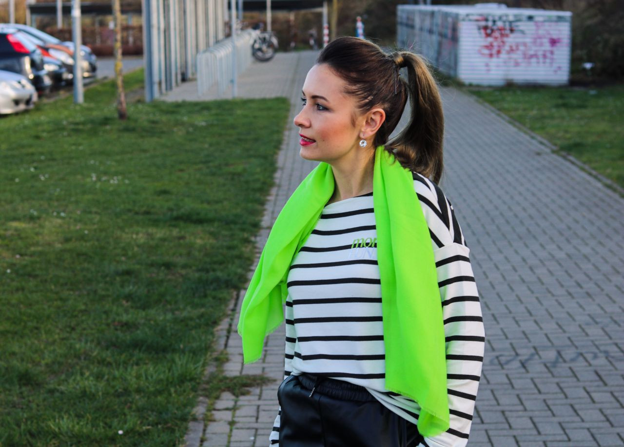 Jedoch das wichtigste Accessoire, das mein Outfit wirklich in Szene setzt, ist ein Schal in Neon-Minze Farbe von Street One. Auf der Seite des Online-Shops von Street One habe ich mehrere Accessoires wie z. B. Gürtel oder andere Schals in der Farbe gefunden, die sich ebenfalls mit dem Streifenshirt gut kombinieren lassen würden. Der grüne Schal war jedoch für mich die beste Wahl, denn der gleiche Farbton finden wir auf dem Frontprint des gestreiften Shirts wieder. Damit schaffe ich einen passenden Kontrast zu den weiß-schwarzen Streifen und dem Schal. Ich finde, dass die knallige Farbe das Outfit wirklich rockt und den kompletten Look zum mega Hingucker macht. Ein Schall gehört zu den Basic-Acceissoires, bei den wir sehr gut den Neon-Trend anwenden können, ohne uns verkleidet zu fühlen. Außerdem gehen wir mit Neon-Gelb und -Grün auf Nummer sicher, denn die Farben mit sehr vielen Sachen harmonieren und nicht so krass wie Pink oder Orange auffallen.