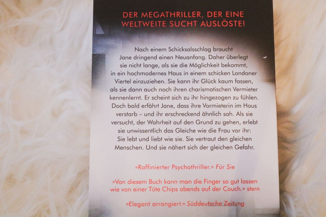 Das neue Haus wird zugleich ein Geschenk des Himmels und ein Fluch. In der Beziehung von Jane und Simon geht alles den Berg ab. Als Jane neue Fakten über die Vergangenheit der vorherigen Mieterin Emma erfährt, beginnt sie selbstständig nach der Wahrheit zu suchen. Sie entscheidet sich das Geheimnis von Emmas Tod zu entdecken. Die Vormieterin ist von ein Paar Jahren in dem House an Folgate Street 1 gestorben. Merkwürdig stellt es sich heraus, dass die beiden Frauen fast identisch aussahen und gleich harte Erfahrungen erlebt haben. Ein Zufall? Und wer ist der mysteriöse Besitzer Edward Monkford und warum möchte er sich der Jane so nähern?